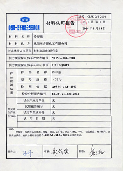 沈陽奧吉娜化工有限公司繼防凍液獲得一汽集團技術中心認證后,DOT3制動液于09年5月13日再次獲得一汽集團技術中心認證,為奧吉娜化工有限公司制動液在一汽集團所屬的汽車制造廠和售服系統(tǒng)推廣提供了及其有力的條件。使得雙方在配套領域的合作關系得到了進一步的加強。同時提升了奧吉娜化工在全國范圍內汽車油品配套領域的知名度和影響力。